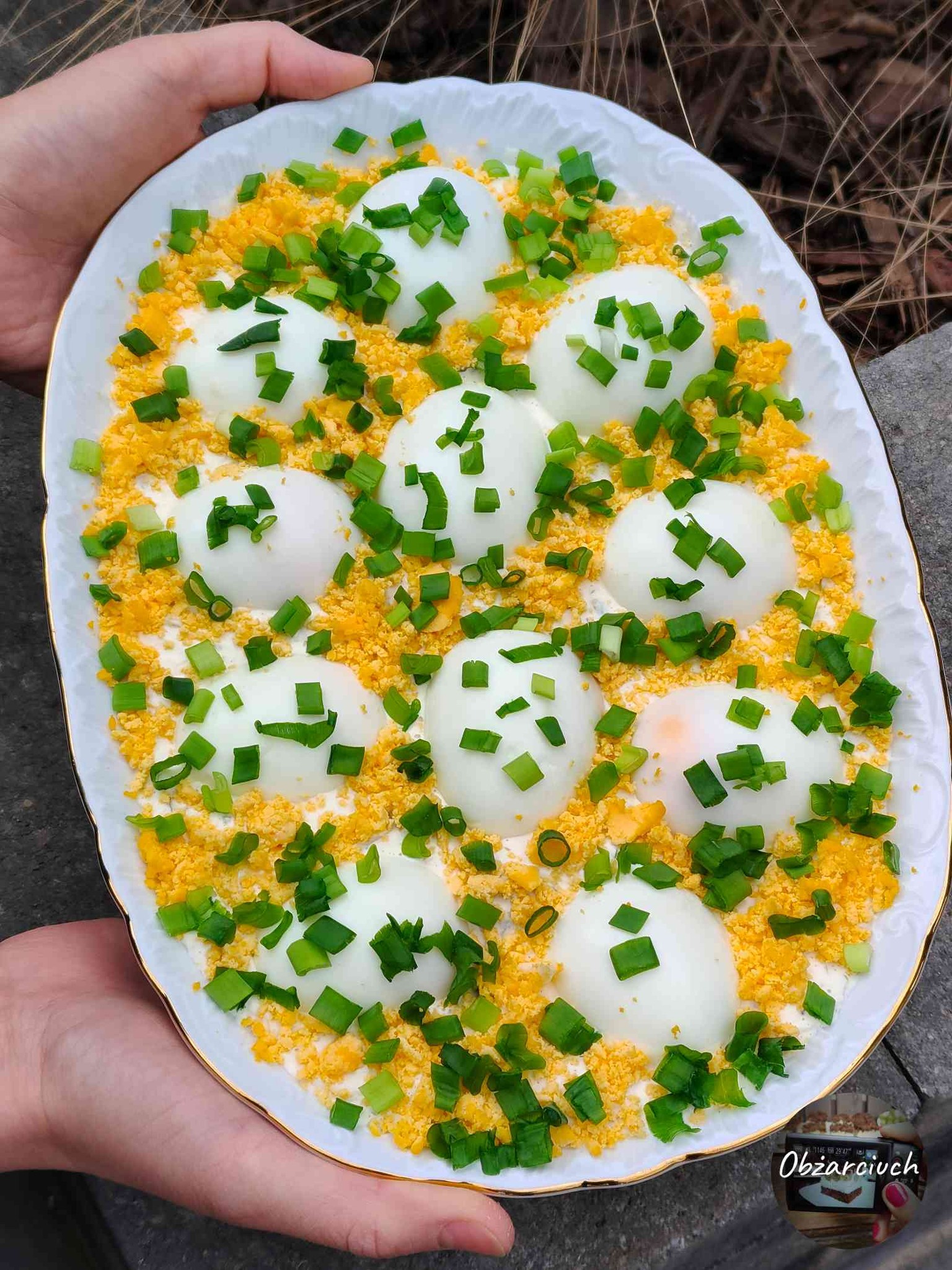 Półmisek z jajkami na pierzynce, posypany startym żółtkiem i świeżym szczypiorkiem.