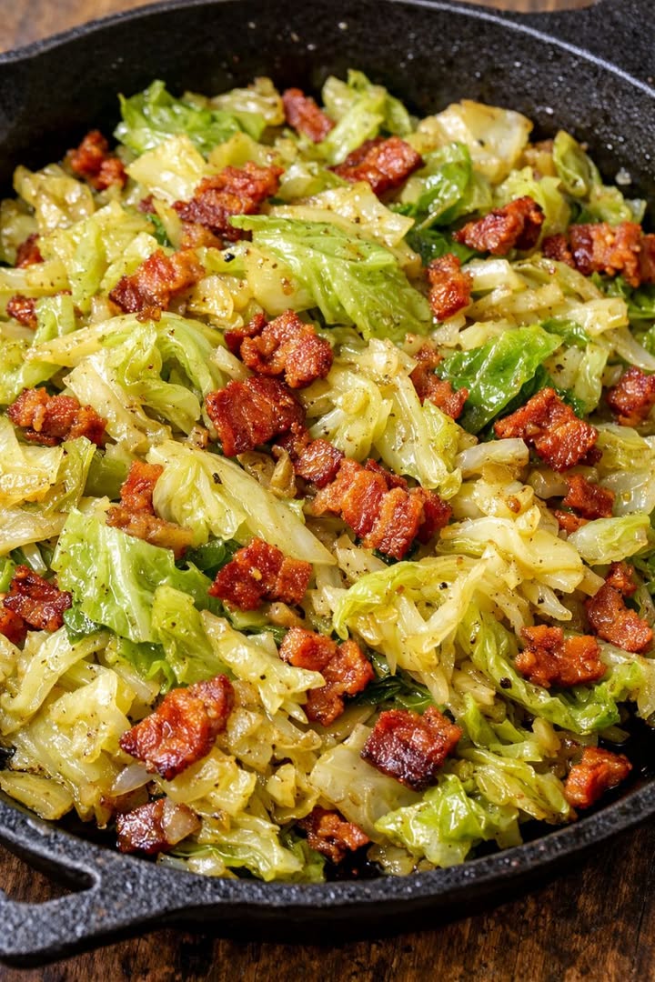 Ta południowa, trzyskładnikowa smażona kapusta to prosty, przytulny dodatek, który pojawia się na każdym rodzinnym spotkaniu w moim świecie. Zaczyna się od boczku skwierczącego na żeliwnej patelni, a następnie wrzuca się dużą porcję kapusty, która zmięknie i wchłonie cały ten pikantny smak. Nie potrzeba długiej listy składników – tylko kapusta, boczek i odrobina soli. To przepis, który babcia robi na wyczucie, zamieniając skromną główkę kapusty w coś, do czego wszyscy sięgają po dokładkę.