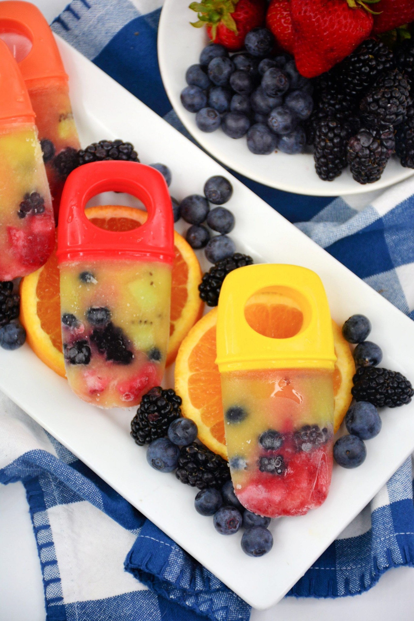 Te mrożone lody owocowe to idealny letni orzeźwiający deser z kiwi, jeżynami, truskawkami i sokiem pomarańczowym.