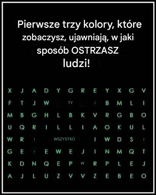 Pierwsze trzy nazwy kolorów, które zobaczysz (np. CZERWONY, NIEBIESKI, SZARY, FIOLETOWY) to Twoje wyniki.