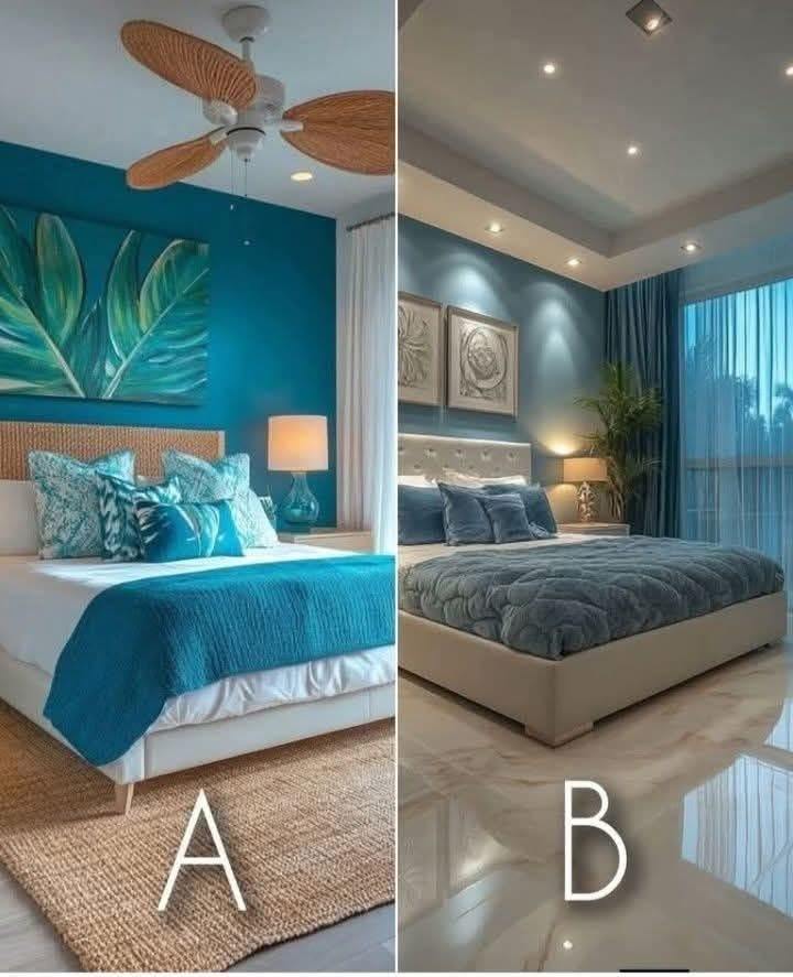 Z jednej strony, pokój A zachwyca świeżymi i naturalnymi kolorami 🌿. Połączenie błękitu i zieleni wprowadza poczucie spokoju, idealne dla tych, którzy lubią kojącą, tropikalną atmosferę