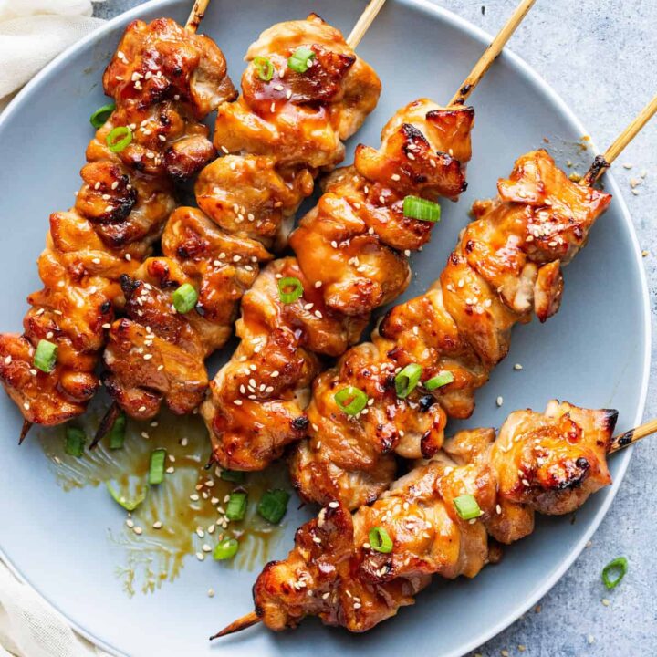 Szaszłyki z kurczaka smażone na gorącym powietrzu – soczyste, delikatne kawałki kurczaka marynowane w aromatycznych przyprawach, nadziane na szaszłyki z warzywami, idealnie przyrządzone w gorącym powietrzu, idealne na szybki i zdrowy posiłek!
