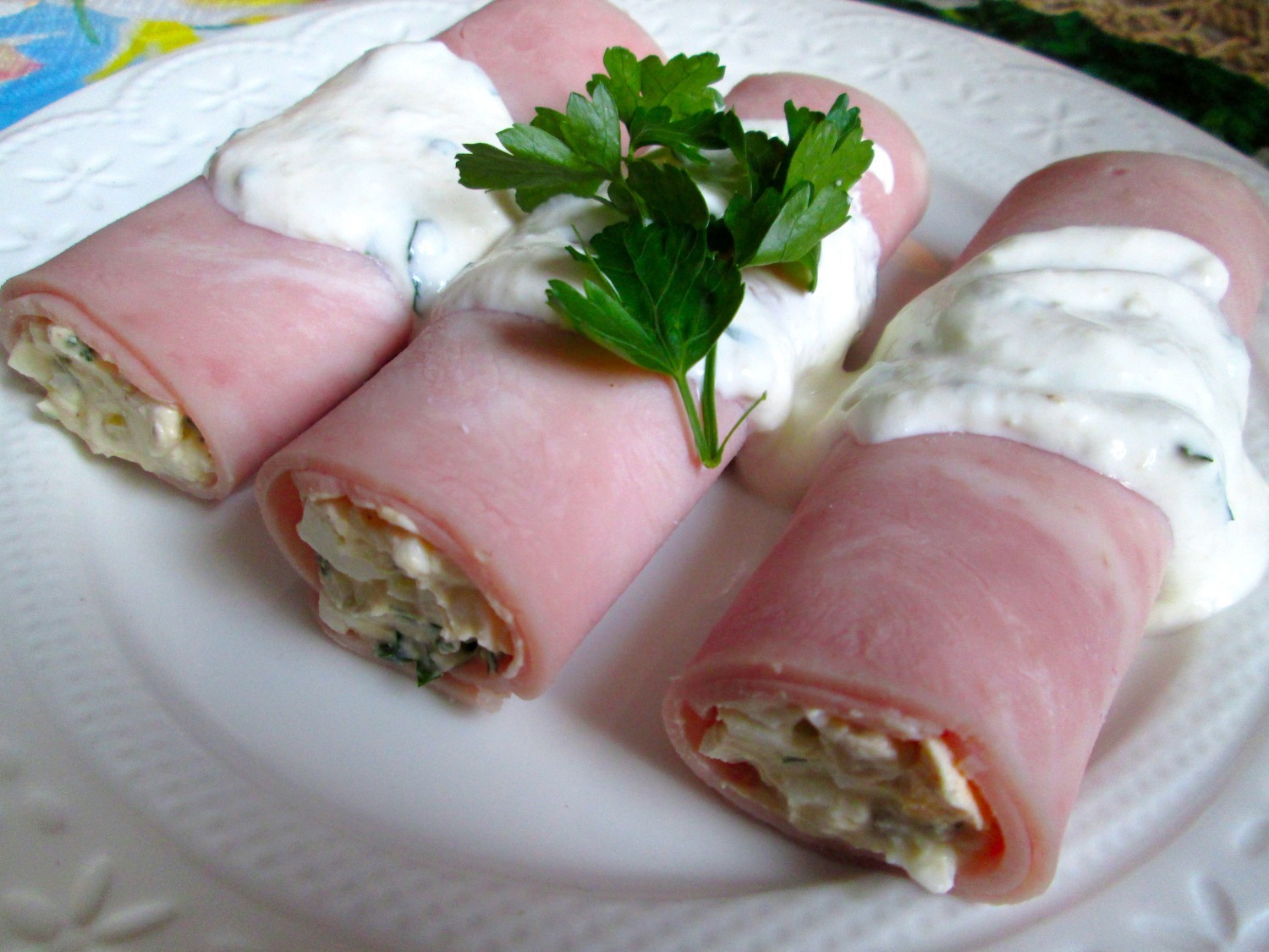 Jaka i ogórki pokroić w drobną kostkę, dodać serek śmietankowy, posiekana natkę pietruszki, przyprawić do smaku i wszystko dokładnie wymieszać. Powstałą pastę wykładać na plasterki szynki i zwinąć w roladkę. Jogurt połączyć z chrzanem, majonezem , posiekaną natką pietruszki, polać roladki powstałym sosem i udekorować natka pietruszki. Podawać na śniadanie wielkanocne.